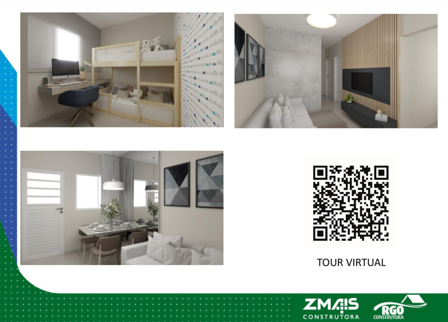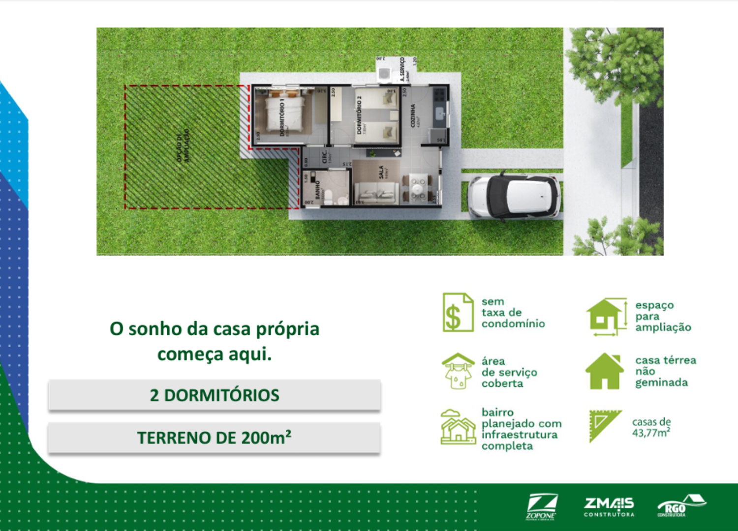 As casas possuem 43,77 m² construídos, em terrenos a partir de 200 m², e contam com:
